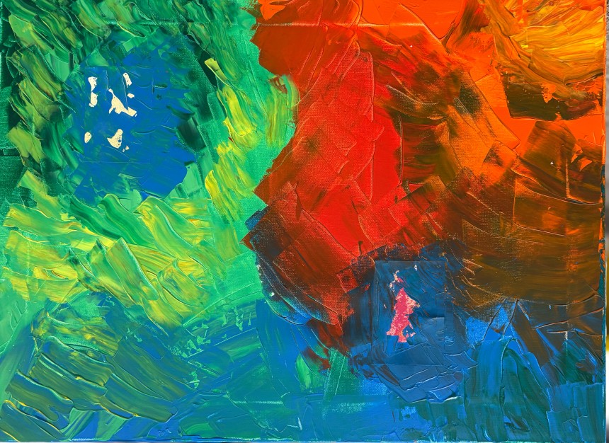 mixed media art, 40 x 50 cm. half hidden is a piece of paper, where i sprayed with different colors.