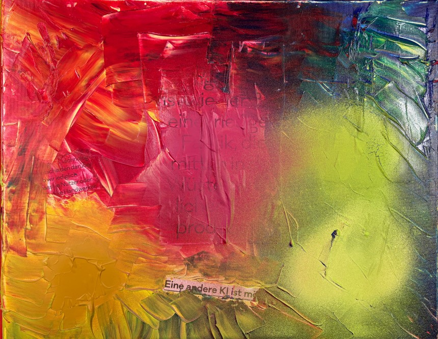 mixed media art, 40 x 50 cm. half hidden are parts of a text from a philosophy magazine about artificial intelligence.
